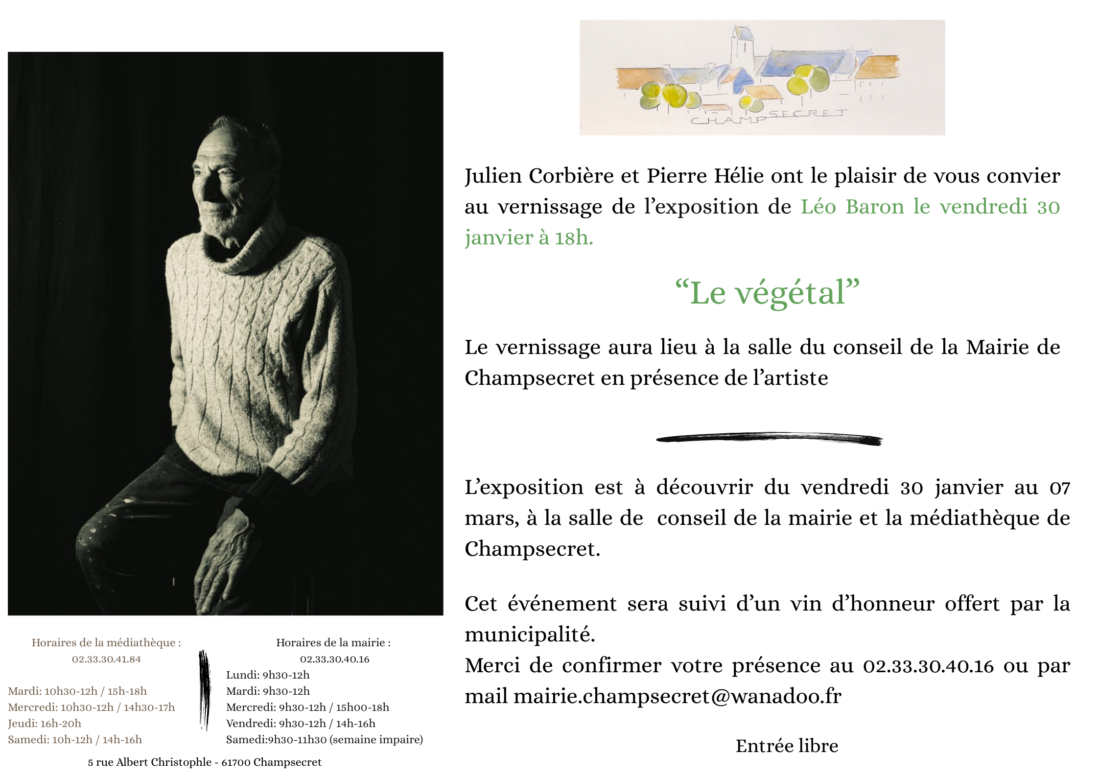 Exposition Léo Baron Auteur/autrice de la publication :Maire-61 Publication publiée :14 janvier 2026 Post category:Non classé Vous devriez également aimer Médecins solidaires – Médicobus 8 décembre 2025 Cuisin’nez partage – Planning 3 octobre 2025 Un nouveau service à la mairie : un îlot numérique ! 29 août 2023