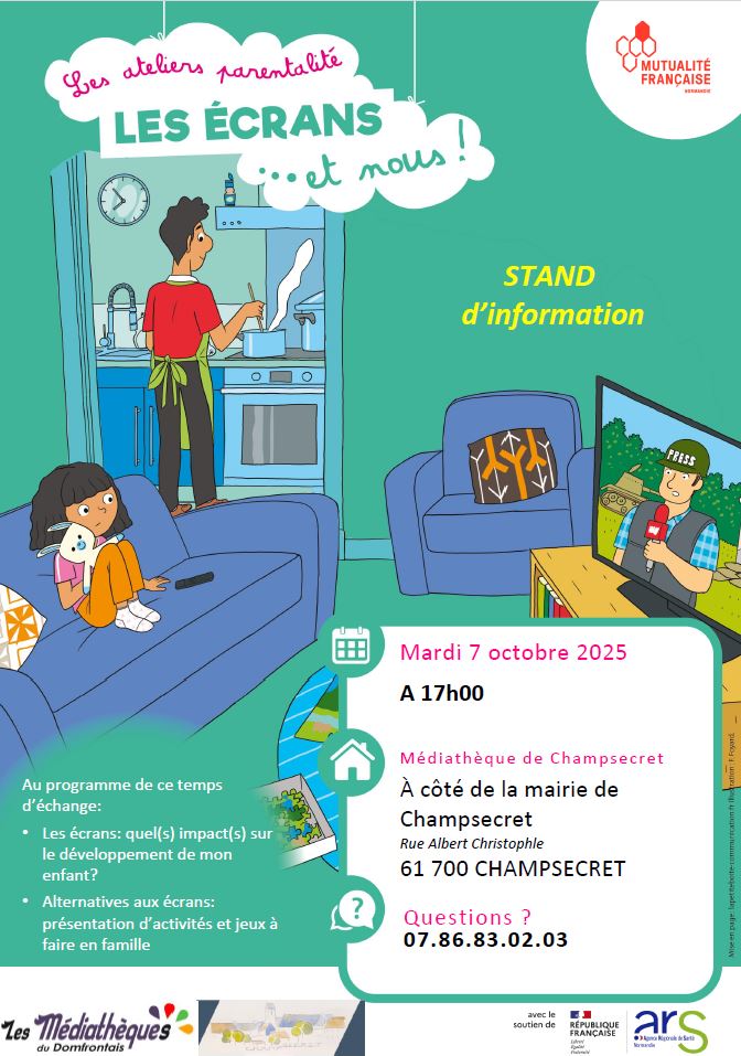 Médiathèque – Les ateliers parentalité « Les écrans et nous » Auteur/autrice de la publication :Maire-61 Publication publiée :3 octobre 2025 Post category:Non classé Vous devriez également aimer Collecte des déchets 2025 6 janvier 2025 Ateliers Qi Gong et méditation 3 octobre 2025 Arrêté de fermeture de l’église de Champsecret 30 janvier 2024
