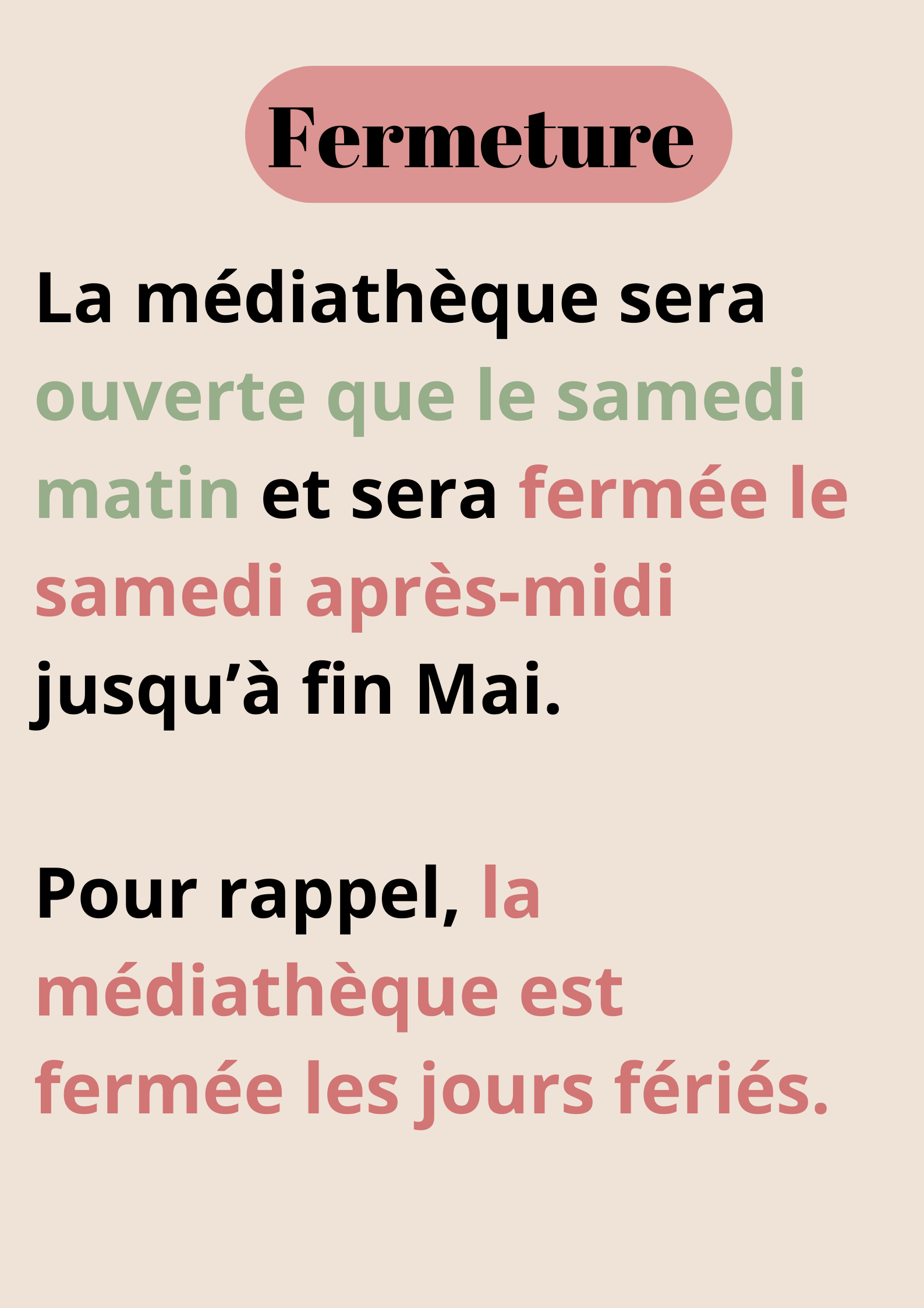 Nouveaux horaires à la médiathèque de Champsecret Auteur/autrice de la publication :Maire-61 Publication publiée :11 avril 2026 Post category:Non classé À partir du mardi 14 avril, la médiathèque de Champsecret change ses horaires !! Nous ouvrons que le mardi après-midi de 15h à 18 h. Nous sommes maintenant ouverts le vendredi après-midi de 14h à 18h et le mercredi jusqu’à 17h30! Vous devriez également aimer Collecte des déchets 2026 2 janvier 2026 Anaïs en tournée, l’épicerie ambulante 17 octobre 2024 Campagne de stérilisation 26 juillet 2023